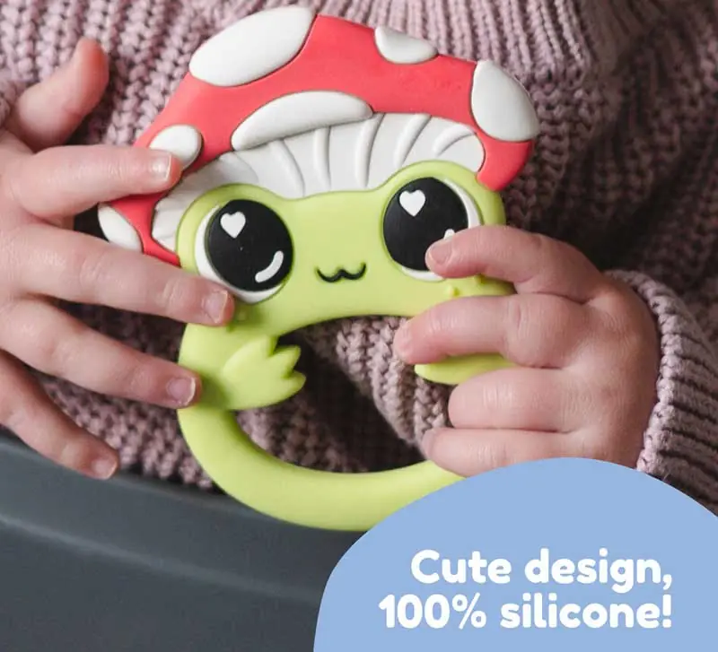Pocket‑sized silicone teether shaped like Finlee under a mushroom. The food‑grade material and varied textures massage sore gums, while the friendly frog design invites grasping and hand‑to‑mouth exploration at home or on the go. £7.49 -