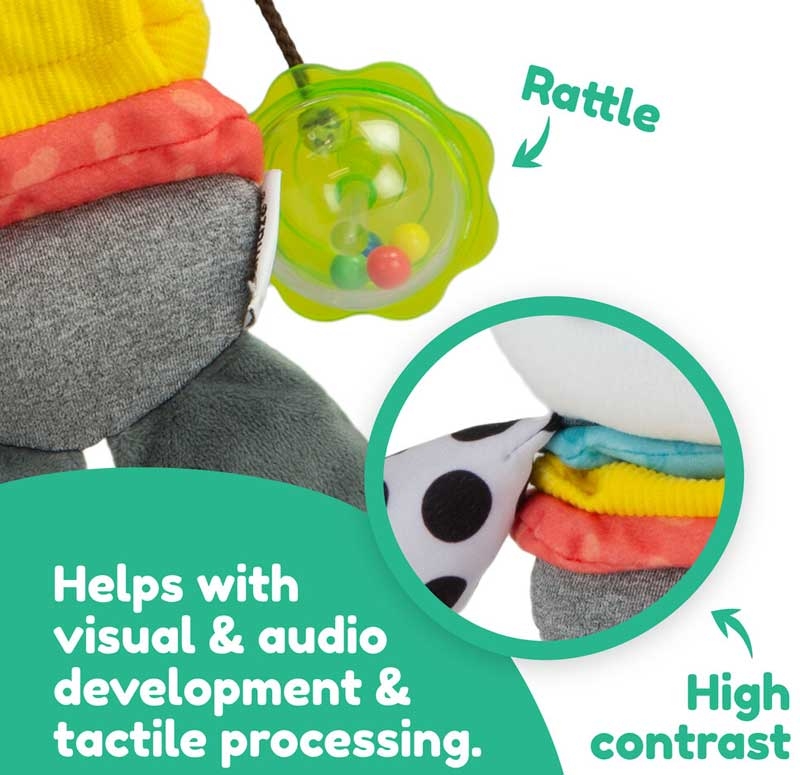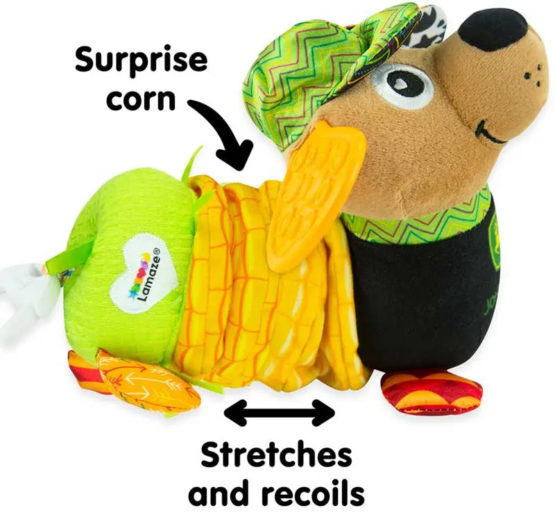 Farm‑inspired clip‑on dog toy with a stretchy nose, high‑contrast patterns and a chewy ear to support sensory discovery and teething. The playful corn motif and jingling chime inspire giggles and fine‑motor exploration on stroller rides and in the car. £15.99 -