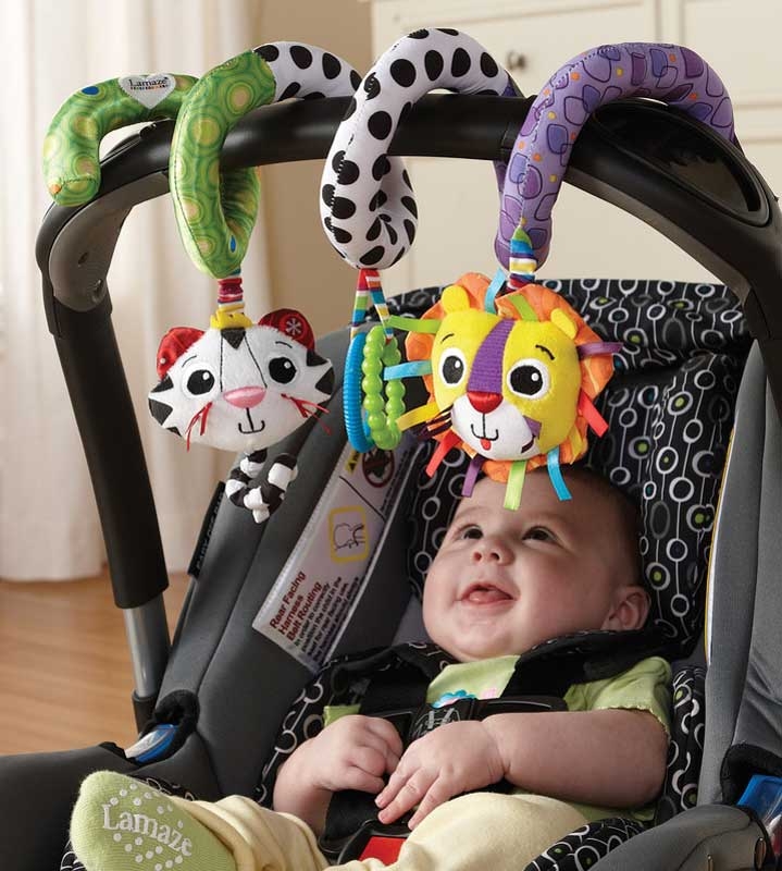 Colourful spiral toy that wraps around car seat handles or stroller bars, featuring clacking rings and dangling toys. £18.99 -