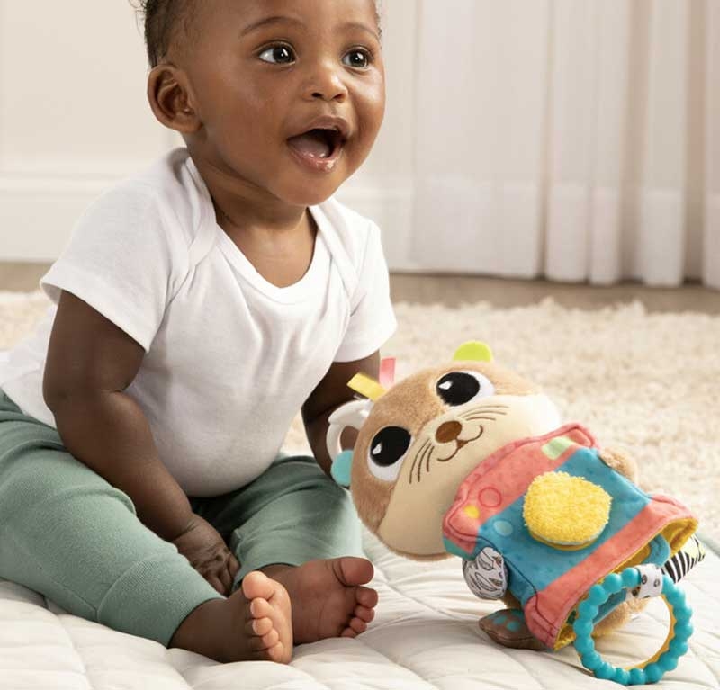 Sea‑themed clip‑on lobster with ribbon claws, a crinkly tail and gentle chime inside. Includes a starfish teether and a variety of fabrics to engage touch and hearing while on stroller journeys, high chairs or car seats. £15.99 -