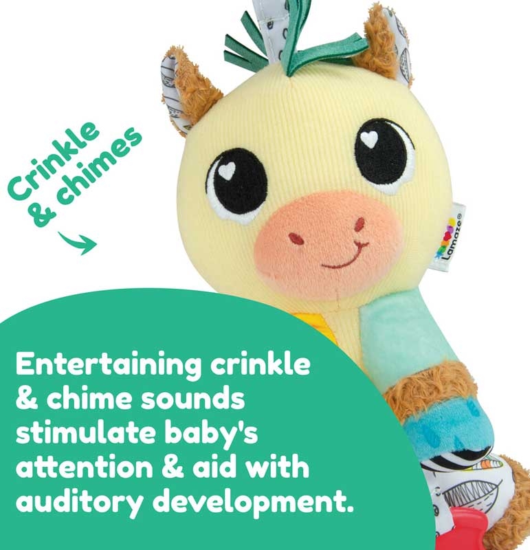 Soft horse toy with multiple textures, a tethered apple teether and a handy stroller clip. £15.99 -
