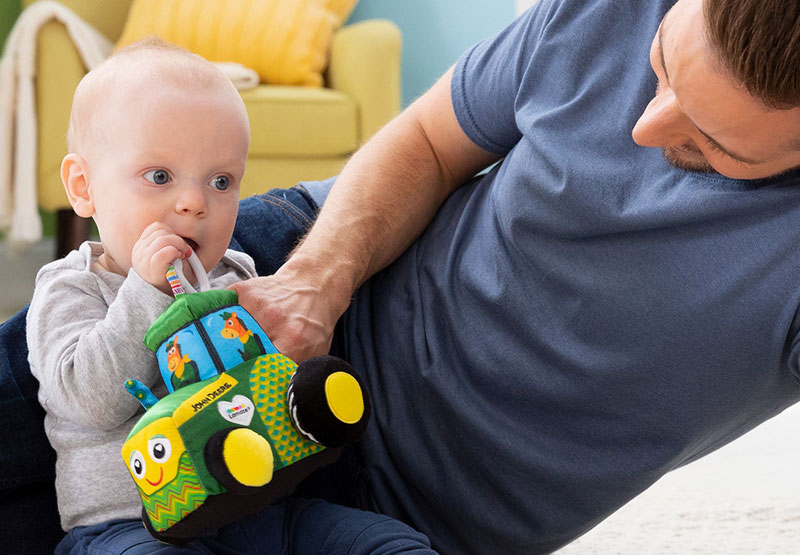 John Deere–themed clip‑on tractor with clicking wheel, high‑contrast patterns and textured surfaces for little hands. £14.99 -