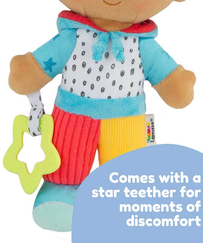 Soft boy doll with crinkly shoes, mixed textures and a star teether that clips to prams. £15.99 -