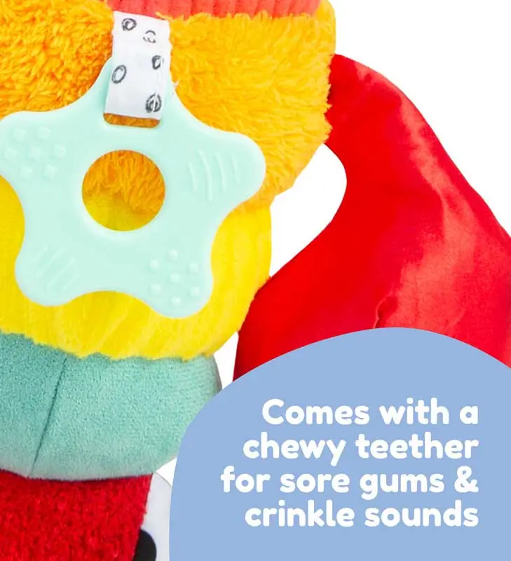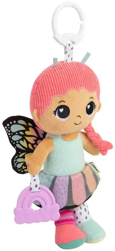 Flower‑themed doll with butterfly wings, crinkly skirt and a rainbow teether that doubles as a clippable handle. Encourages imaginative play, tactile exploration and teething relief during errands or stroller outings. £15.99 -