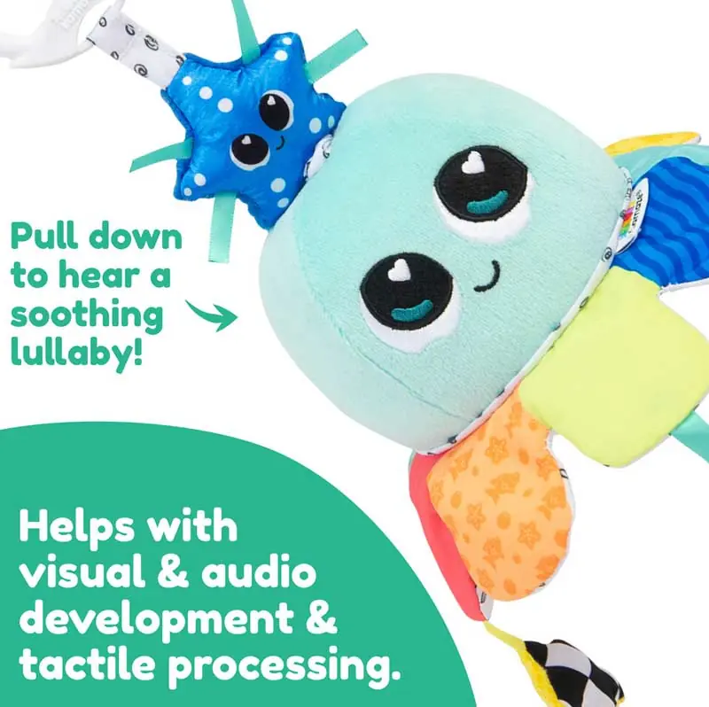 Lullaby‑playing octopus stroller toy with a pull string that triggers a calming melody and gentle vibrations. Textured tentacles, mirror and soft ribbons invite sensory exploration while supporting self‑soothing on the go. £18.99 -