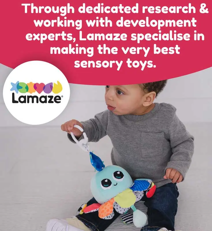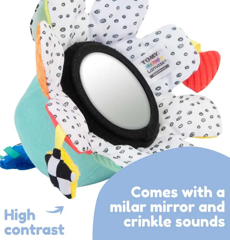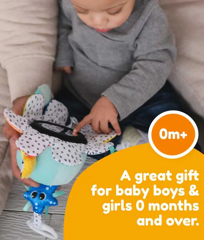 Soothing Salty Sam is a gentle octopus designed to calm babies on the go. Pull his body to hear a soft lullaby and watch him slowly rise. His tentacles have silky ribbons and tactile fabrics, plus there’s a mirror to engage visual exploration. Clip to a stroller for soothing playtime.